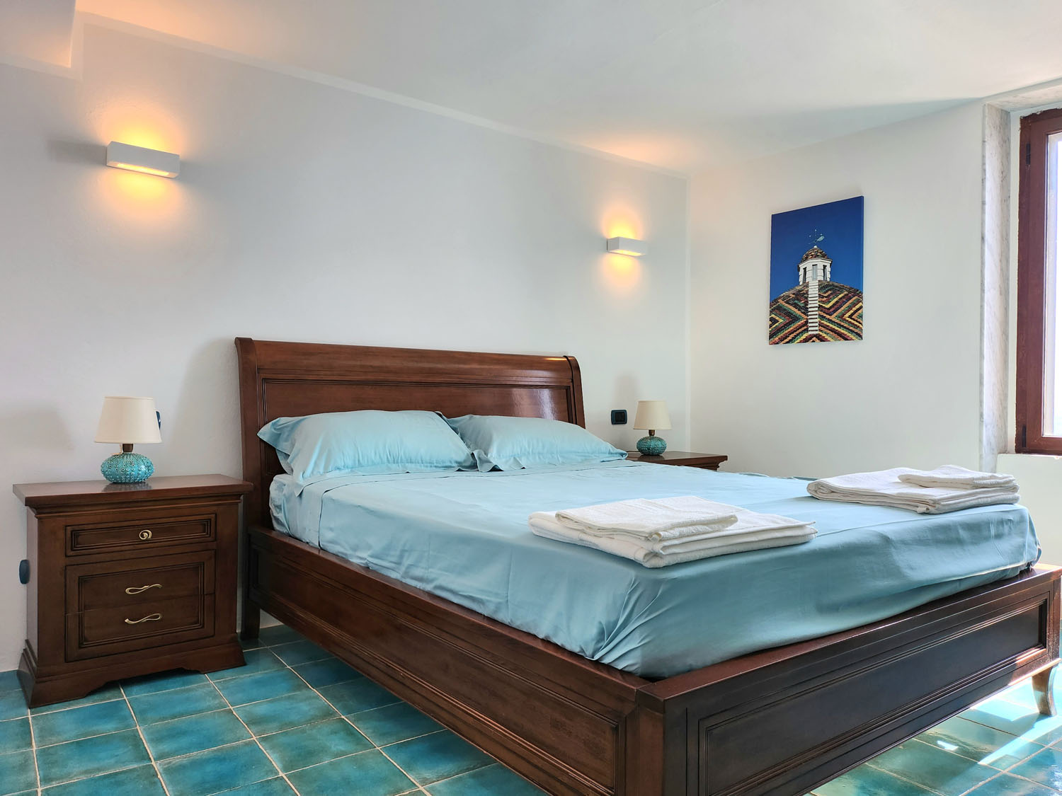 La chaise-longue in elegante stile marinaro e l’ampia finestra affacciata sul mare aggiungono un tocco di esclusività, mentre i toni neutri delle pareti e i pavimenti azzurri creano un’atmosfera serena, perfetta per rilassarti.